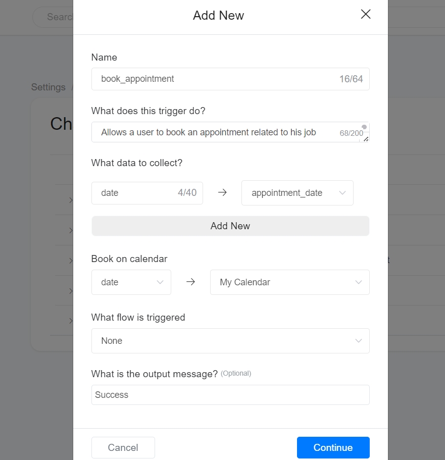 Name: book_appointment What does this trigger do?: Allows a user to book an appointment related to his job application. What data to collect? date -> appointment_date Book on calendar: My Calendar What flow is triggered: None What is the output message? : Success