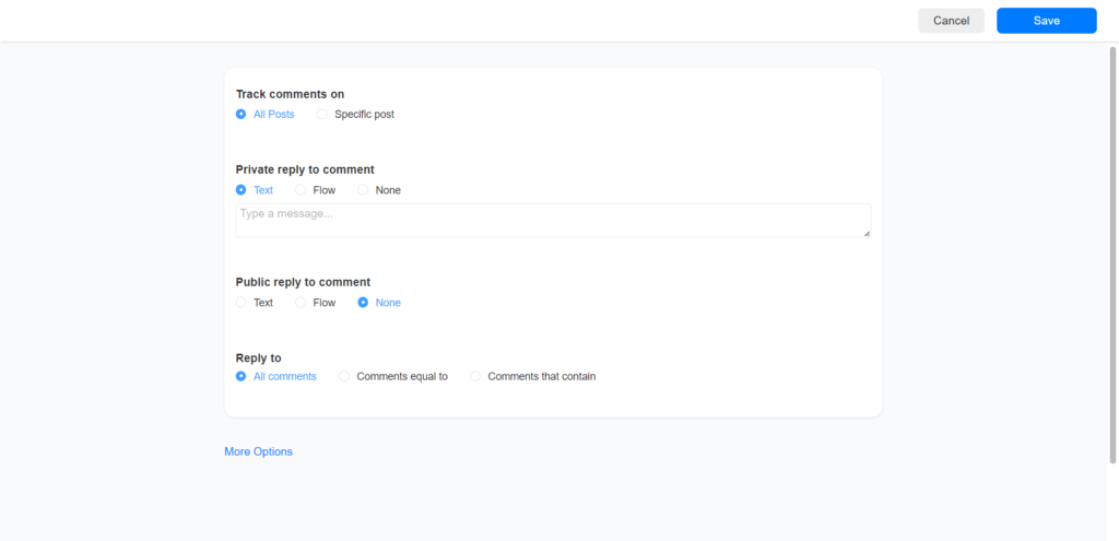 You can set up Facebook comment automation on a specific page post, all page posts, reels, or Fb Ads. This tool helps your business to increase engagement with your audience.