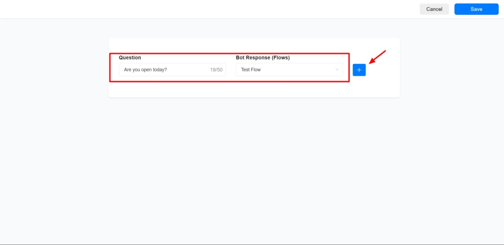 Input your business’s frequently asked questions, set the response flow, click on the + icon to add it and click on save on the top right corner.