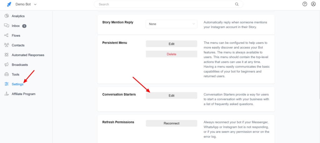 To create a Conversation Starter for your business, Navigate to Menu > Settings > Channels (Messenger/Instagram) > Conversation Starter and click the “Edit” button.