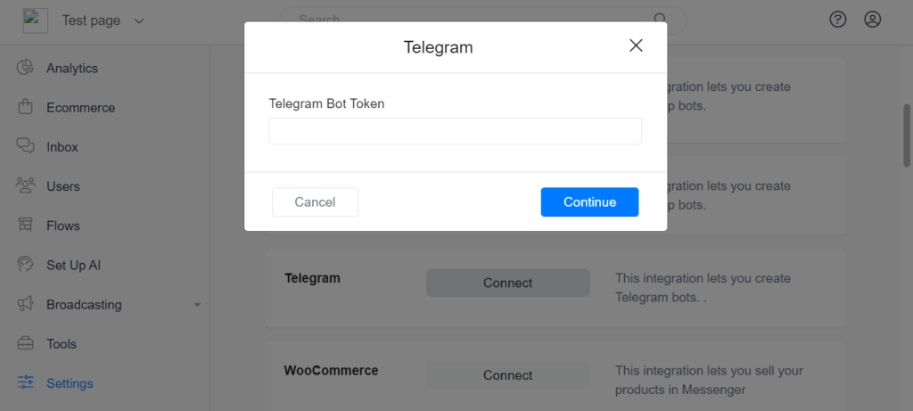 2 – Setup Telegram on Business Robots Ai. Navigate to Settings > Integrations and find Telegram. You only need to specify your Telegram bot token and Business Robots Ai will automatically integrate with Telegram and your bot is ready to respond to users.