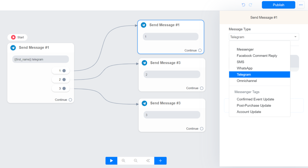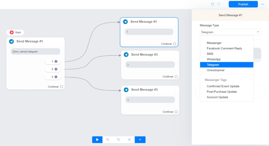 3 – On the flow builder, you will use Telegram or Omnichannel as a message type. We recommend that you use Omnichannel whenever possible.