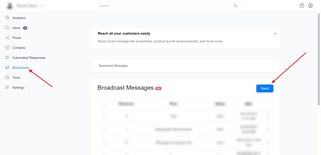 The broadcast tool allows you to send messages to multiple contacts simultaneously in an automated manner. It helps businesses to send announcements, discounts, updates, and other notifications to their contacts.
